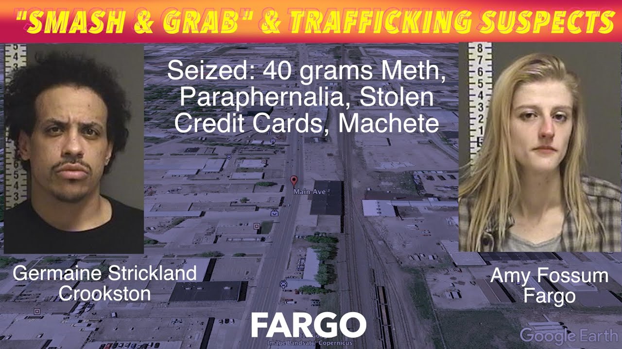 FARGO, ND (iNewZ.TV) A Crookston man and Fargo woman are suspects in a "smash and grab" and drug trafficking in Fargo. Germaine Strickland and Amy Fossum are each facing a felony charge of Possession with Intent to Deliver Meth.