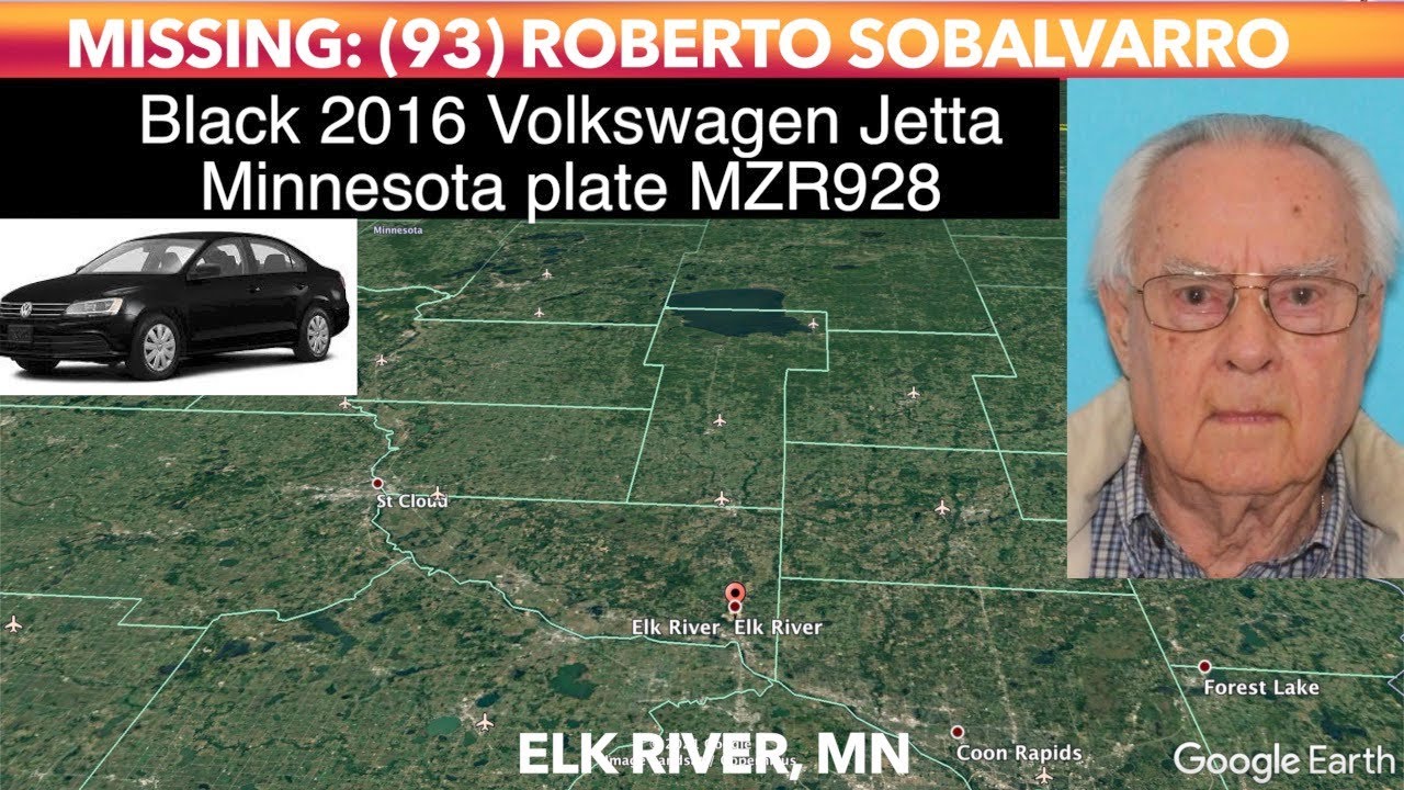 ELK RIVER, MN (iNewZ.TV) The Minnesota BCA has issued a missing person alert for 93-year old Roberto Sobalvarro. He drives a black 2016 Volkswagen Jetta, Minnesota plate MZR928. Sobalvarro has dementia.