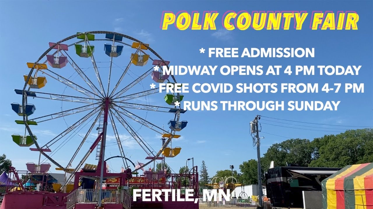 FERTILE, MN (iNewZ.TV) The annual Polk County Fair in Fertile, Minnesota is off and running through Sunday. The midway opens at 4 pm on this Thursday and everyone 12 and older can get a free, COVID shot at the Polk County Public Health booth, between 4 and 7 pm.