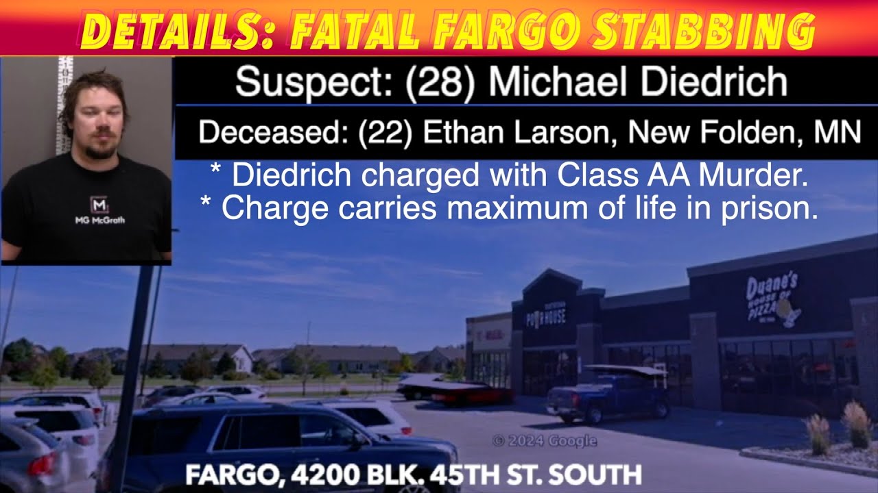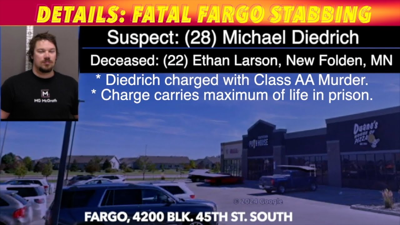 FARGO, ND (iNewZ.TV) We hnow have more details regarding a fatal stabbing outside a Fargo bar early Saturday morning. Michael Diedrich of Fargo has now been charged with a Class AA felony of Murder in the stabbing death of Ethan Larson.