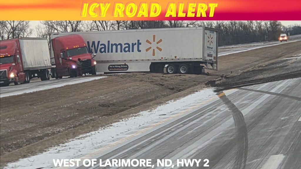 LARIMORE, ND (iNewZ.TV) An icy highway alert in the Northern Valley. Jack knifed semi on Highway 2 west of Larimore,…